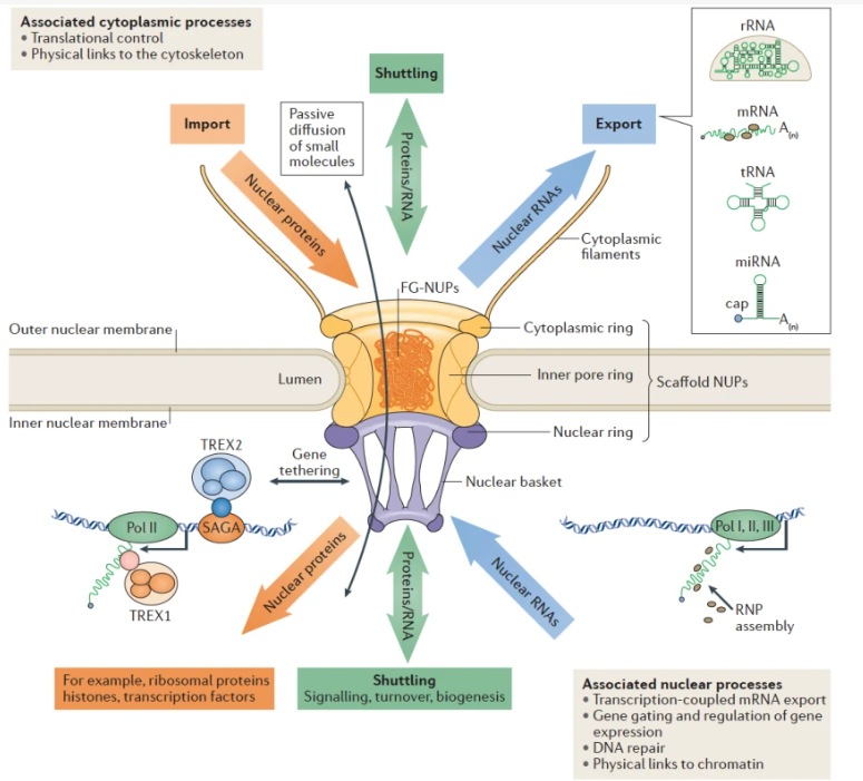 这些核转运蛋白通过与NPC上富含FG序列的核孔蛋白结合介导含有NLS或核输出序列(NES)的蛋白载体出入核质。