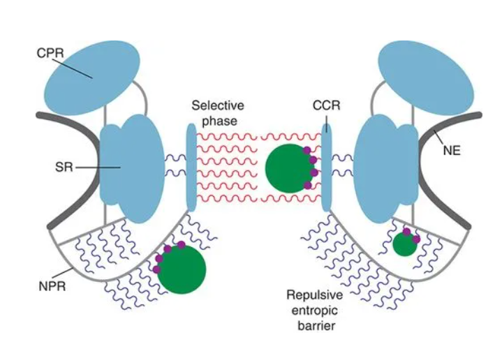 包含FG序列的蛋白不仅形成了通过NPC自由扩散的屏障,而且还作为核转运蛋白的特异性结合位点。