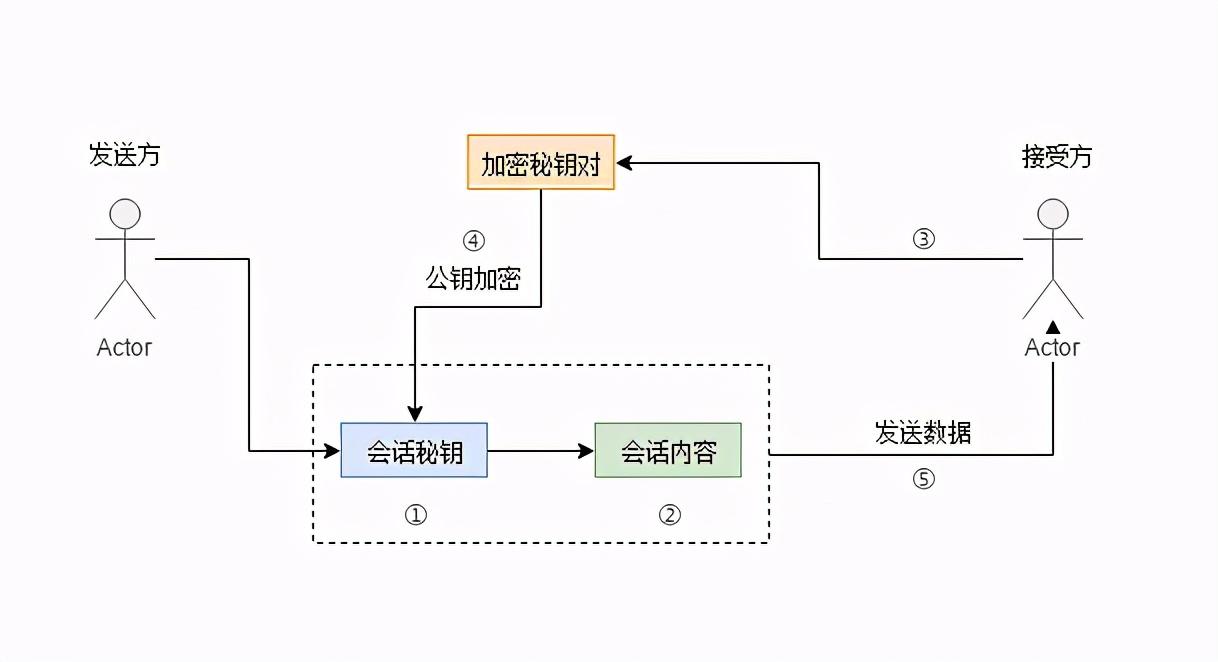 在实际的数据通信中,首先发送方产生一个用于实际数据加密的对称算法密钥,此密钥被称为会话密钥 ,用此密钥对所需处理的数据进行加密。然后,发送方使用接收方加密密钥对应的公钥对会话密钥进行加密,连同经过加密处理的数据一起传送给接收方。接收方收到这些信息后,首先用自己加密密钥对中的私钥解密会话密钥,然后用会话密钥(对称秘钥 )对实际数据进行解密。