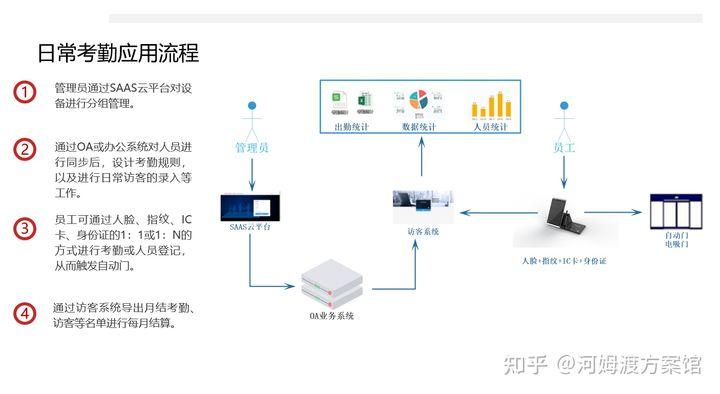 管理员通过SAAS云平台对设备进行分组管理。通过OA或办公系统对人员进行同步后,设计考勤规则,以及进行日常访客的录入等工作。员工可通过人脸、指纹、IC卡、身份证的1:1或1:N的方式进行考勤或人员登记,从而触发自动门。通过访客系统导出月结考勤、访客等名单进行每月结算。