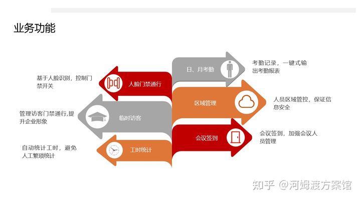 人脸门禁通行:基于人脸识别,控制门禁开关临时访客:管理访客门禁通行,提升企业形象工时统计:自动统计工时,避免人工繁琐统计日、月考勤:考勤记录,一键式输出考勤报表区域管理区域管理:人员区域管控,保证信息安全会议签到:会议签到,加强会议人员管理