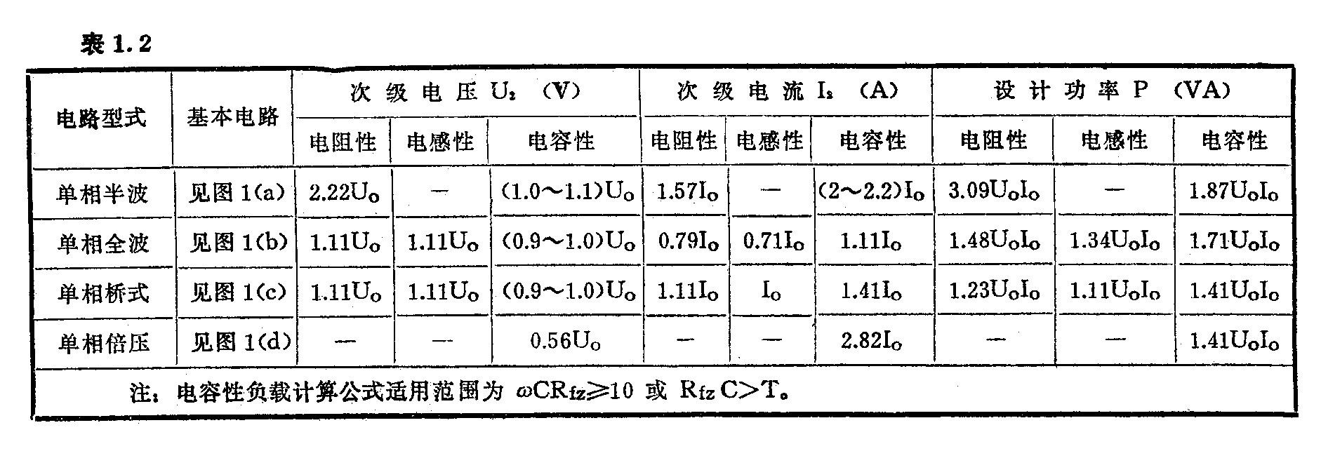 根据选定的整流电路和滤波电路(或负载)的型式,就可以从表1.2中查出高压变压器的容量(设计功率)。