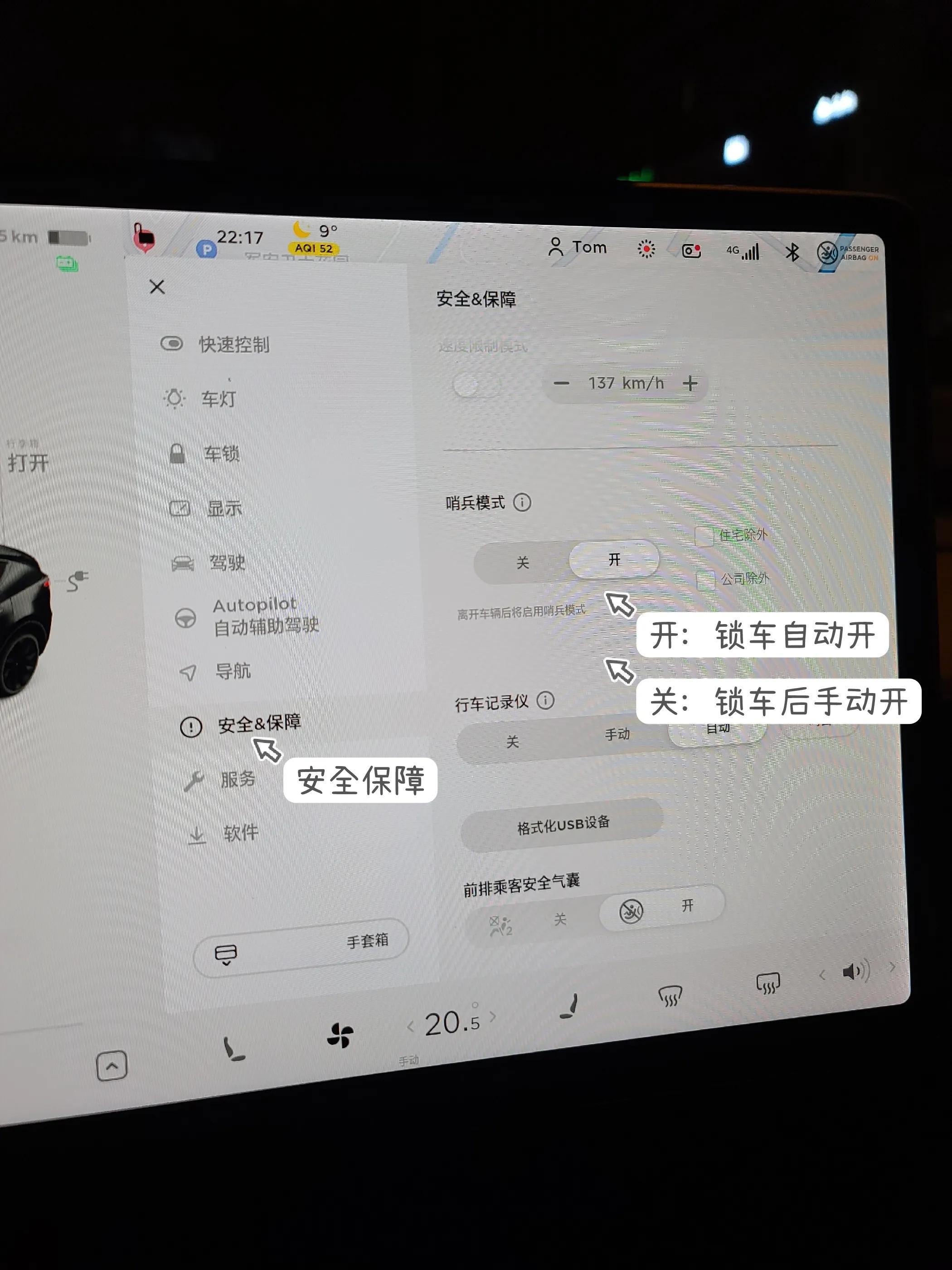 tesla 哨兵 模式如何启用?1/8在特斯拉的触摸屏上面,左下角的位置有一个控制按钮,点击一下这个汽车图标一样的按钮。2/8点击控制按钮之后,旁边会弹出一个子菜单,选择其中的安全选项...