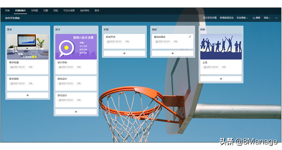利用现代的8Manage看板解决信息交互问题,实现终端信息向项目决策层实时、动态反馈,决策层可以及时、准确地导出各个重要时间节点的进度报表、成本报表、质量问题报表、资源消耗量报表等,通过对比分析找出原因,并采取纠偏措施,为下一道看板信息的发出提供依据。