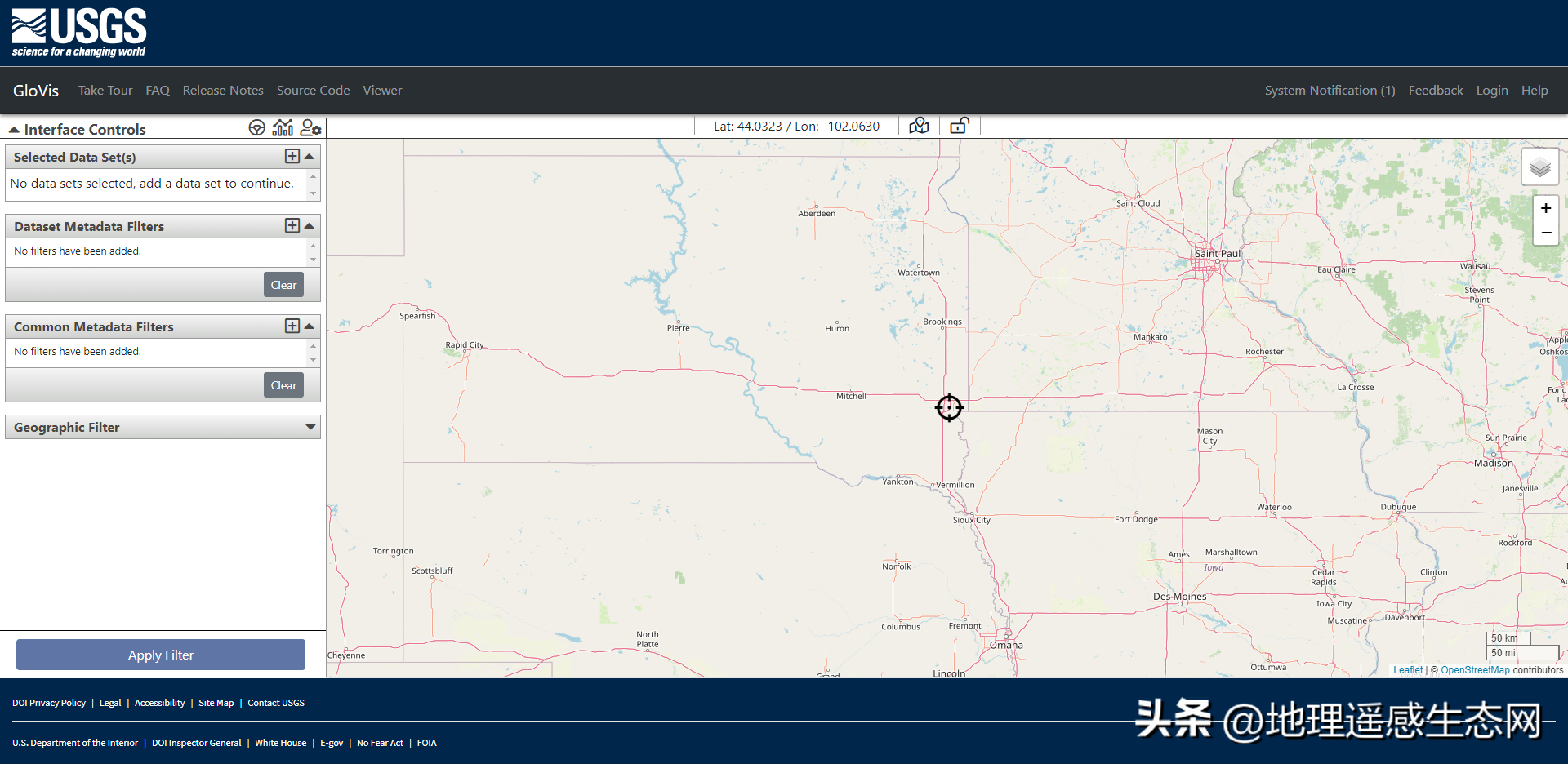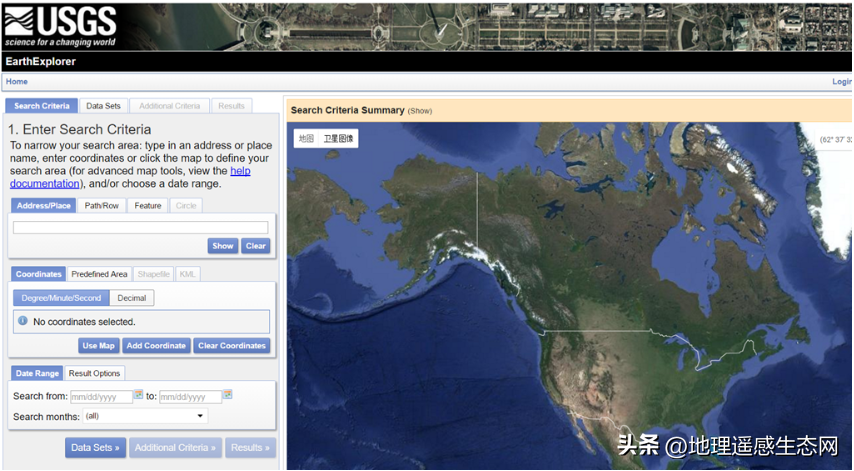 这个网站下载操作比较简洁。 如下图所示,可以根据很多条件查询,包括经纬度、轨道号、成像时间、地图范围等。按照网站引导一步步走下去就能下载影像,操作比较简单,速度还不错。