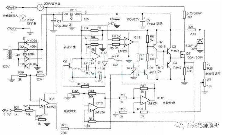 如此周而复始,C3接连产生类如锯齿波脉冲,锯齿最大幅度略低于反相端基准电压,该脉冲送ICIB反相端作为PWM周期比对脉冲;而ICIB同相端输入控制信号:此信号由经ICID单元与电流反馈信号比较处理后输出。可以看出:如果控制信号幅度小于脉冲信号幅度,则ICIB输出低电平;而控制信号大于脉冲信号幅度,ICIB输出高电平。所以控制信号幅度变化转换为输出脉冲宽度变化;且每个锯齿波周期内信号幅度越大,ICIB输出脉冲越宽。信号幅度越小,IC1B输出脉宽越窄。 显而易见,IC1D输出的脉冲宽度变化,使场效应管每周期导通时间变化,即可达到控制负载电流的目的。这就是各类PWM控制的基本原理。PWM方式的应用,既使功率器件工作在能耗极小的高频开关区域,又能使功率器件产生等同线性工作时的控制效果。 R12、R13、R14、IC1C组成电流取样放大部分,作用是将电流变化转换成一定幅度的反馈电压。其增益为10倍,由调节R13与R12比例决定。ICIC输出信号作为电流反馈信号输运到ICID单元作比较处理。 ICIC输出送至ICID反相端,与同相端电流给定信号作减法运算。电路中R15、R16、R17、R18阻值相等,构成一个标准减法器。图中为给定电压减去反馈电压。这可以理解为一旦给定电压确定后,如果由于某种原因电流上升,则ICID输出电压下降;由于电池电压下降导致电流下降时,IC1D输出电压上升。由于IC1D的作用,在很大程度上补偿了放电电流波动时的幅值变化,使之接近恒流放电情况。 R7~R10、Q1、Q2、Q3、Q4组成PWM驱动电路。IC1B输出高电平时,Q1、Q2、Q3导通,Q3导通使Q5(场效应功率管)得到接近15V的栅压而导通,此时Q4反偏截止。ICIB输出翻转为低电时.Q1、Q2、Q3、截止,Q5栅压消失,此时,Q4正偏置导通,使Q5栅极快速放电而可靠关断! Q3、Q4这对开关管的作用是:以足够的驱动功率克服场管的栅、源的电容效应使Q5可靠开关。 这是一个用于场效应管的经典电路,非常可靠,驱动能力也很强,笔者曾用来驱动数百安培的大功率器件,效果很好。 用于电池欠压保护的电路由R20、R19组成电压取样至IC2反相输入端。6.3V由R21、W2、R22组成欠压设定电路,设定电平信号至IC2同相输入端。在电源电压取样信号大于设定信号时;IC2输出为低电平,此时,T1不动作。一旦电源电压取样信号小于设定信号时,IC2输出端翻转为高电平,T1导通并自锁。T1导通,使Q1失去偏压而截止,中断了PWM驱动信号的传输,使电子开关随机关断,达到电池欠电压保护的目的。T1的自锁是为了防止关闭放电后,电池端电压回升使IC2输出翻转,系统重新进入工作区而频繁开关激发机振的必要措施。
