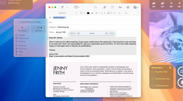 虽然写作工具是系统级功能,不仅限于邮件应用,但苹果特别指出该工具在邮件应用中的使用。借助写作工具,你可以要求Apple Intelligence帮助你使邮件更加友好、专业或简洁。