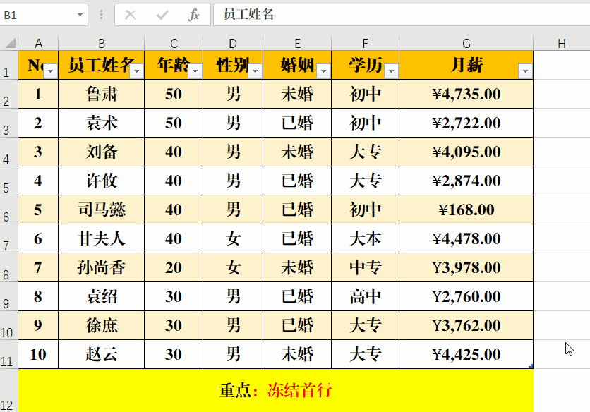 四、Excel 超级表:冻结首行。