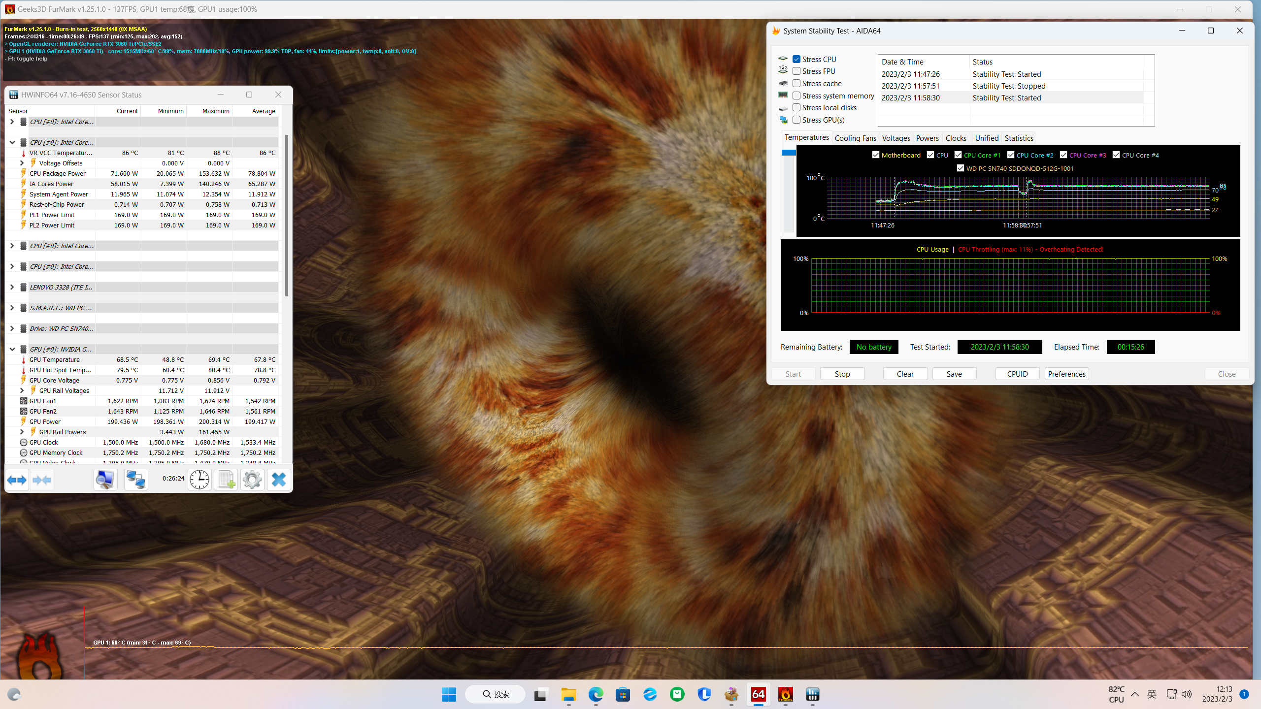 烤机15分钟,CPU平均温度86℃,最高温度88℃,平均功耗在78.804W,GPU功耗最高约为200W,温度最高为69.4℃,风扇转速在1550 RPM左右。这温度和功耗对于13代酷睿来说已经让我很满意了。