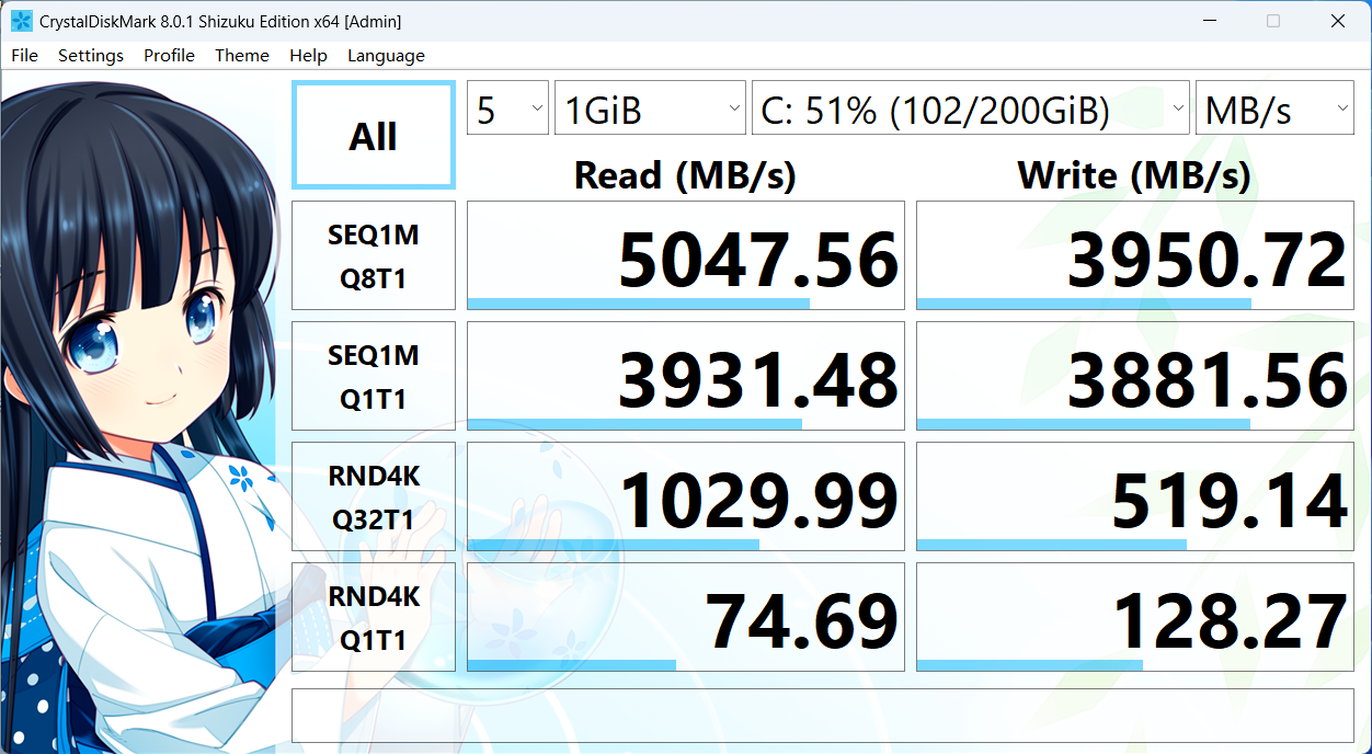 使用DiskMark测试硬盘读写速度,测试结果表明顺序读取最高可达5047MB/s,顺序写入最高可达3950MB/s。