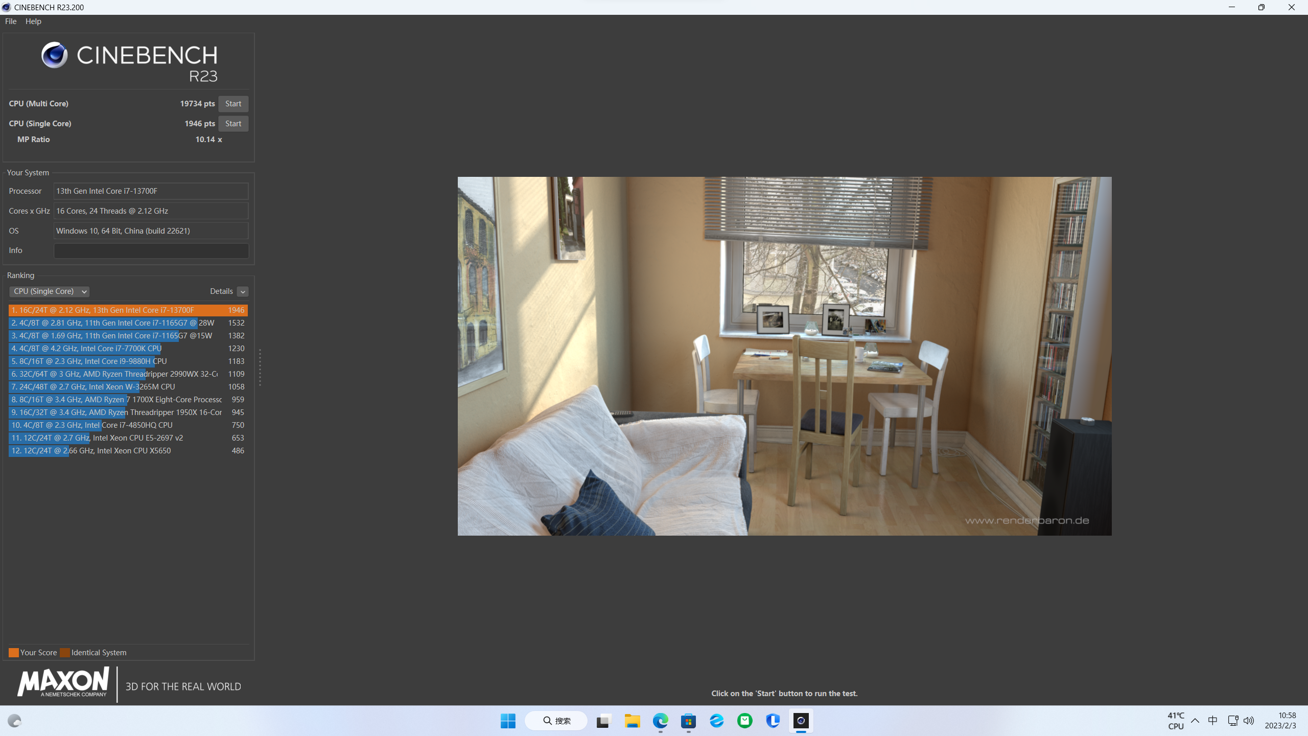 接着是CINEBENCH,这款是由MAXON设计的测试软件,能够准确评估处理器的性能,本次测试使用R23版本进行两次连续跑分测试。第一轮测试中,英特尔i7-13700F单核跑分1960分,多核跑分19757分;第二轮测试中,单核跑分1946分,多核跑分19734分。性能表现十分强悍,并且跑分成绩很稳定。