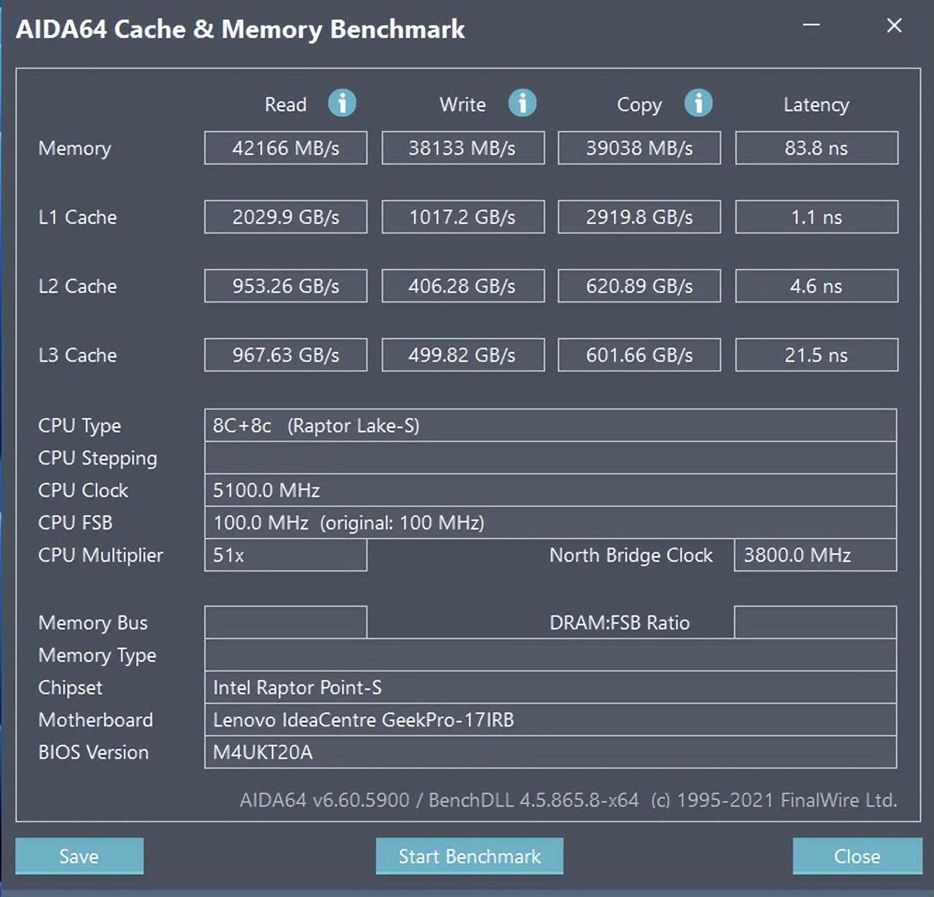 使用AIDA测试内存与缓存成绩,读取速度为42166MB/s,写入速度为38133MB/s,延迟为83.8ns。