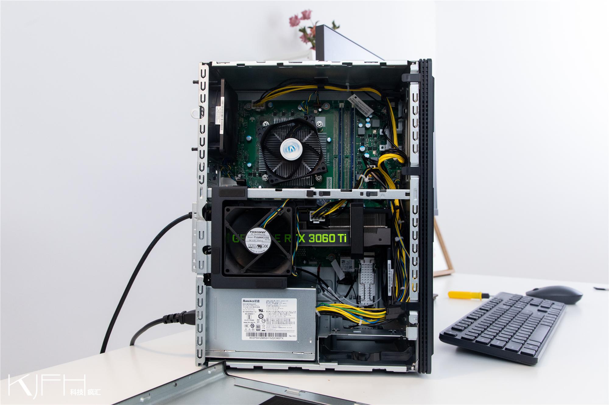 将机箱侧面拆下,可以看到新款GeekPro主机内部的排布还是比较友好的,拆卸简单,方便了小伙伴日后自己对硬件的动手升级。机箱的体积是17L,比上一代要大,所以能够支持更大尺寸和更高功耗的显卡,并且具有较好的散热空间条件。