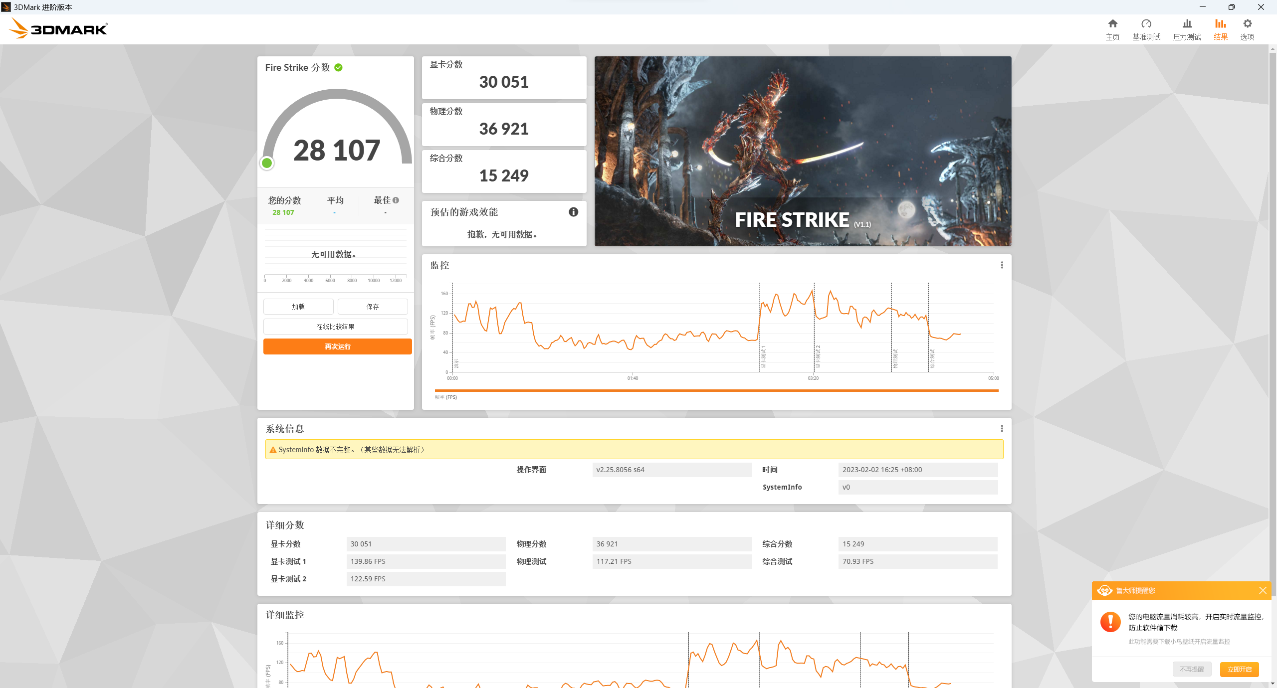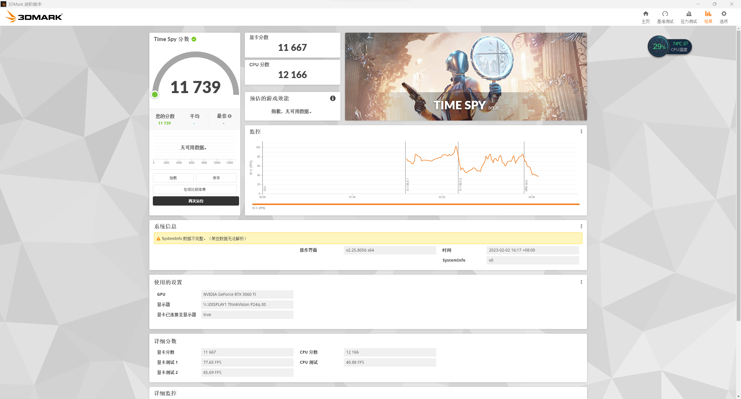 我手上这台搭载的是RTX 3060Ti 8GB显卡,它强大的图形处理能力自然不用多说。第一轮的跑分结果显示,在Fire Strike和Time Spy的跑分成绩为28107分和11739分,这个成绩应对设计剪辑和大型游戏都是绰绰有余的。