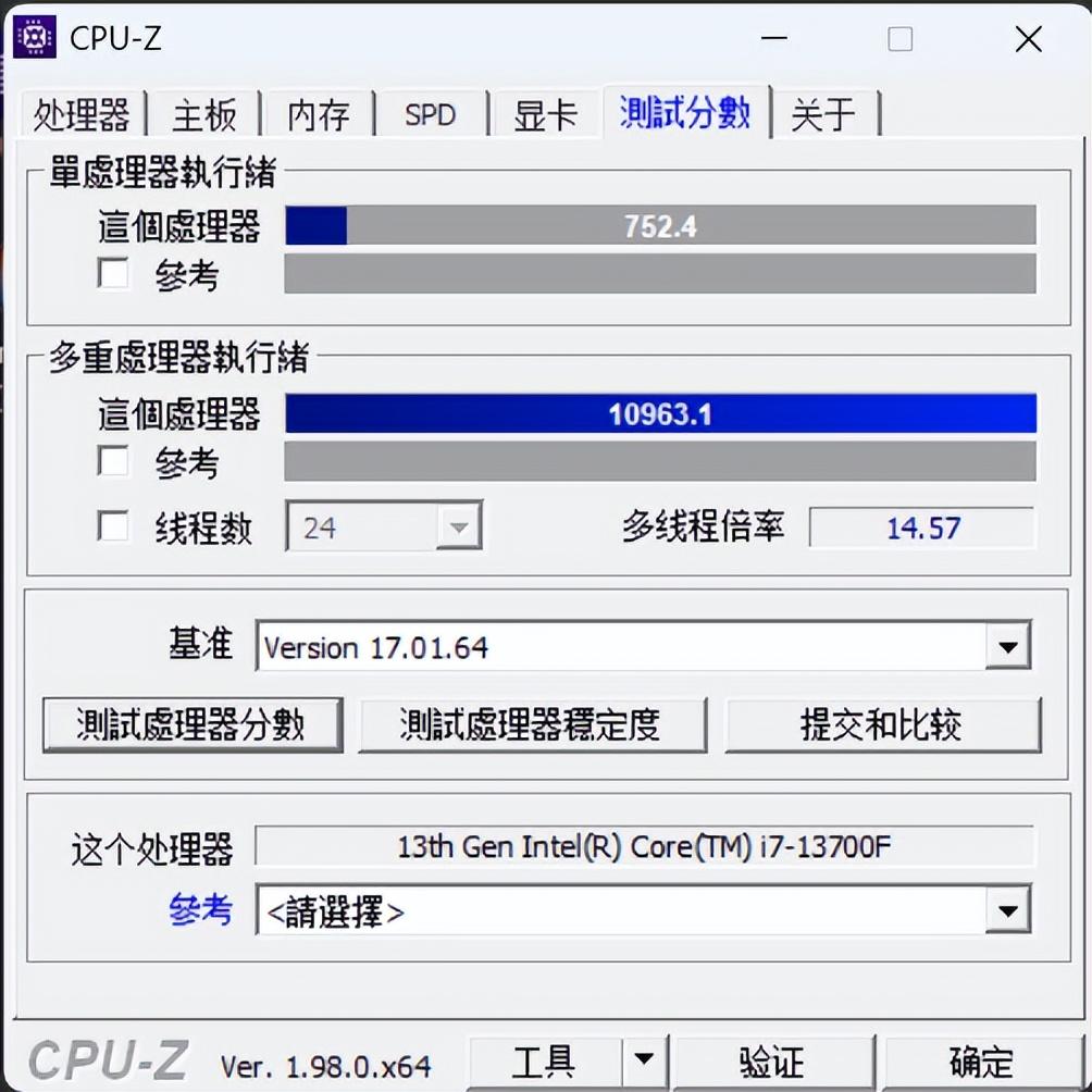 首先是CPU-Z性能测试,它可以反映处理器的单、多核心的性能表现。英特尔i7-13700F处理器采用16核心设计,包括8个性能核心和8个效能核心,提供24线程,相比上一的提升还是相当明显的。两次的测试结果中,英特尔i7 -13700F单核跑分成绩分别为752分,多核跑分则为10963分。