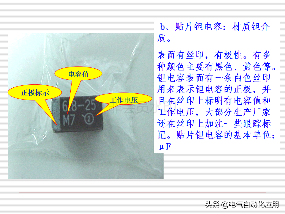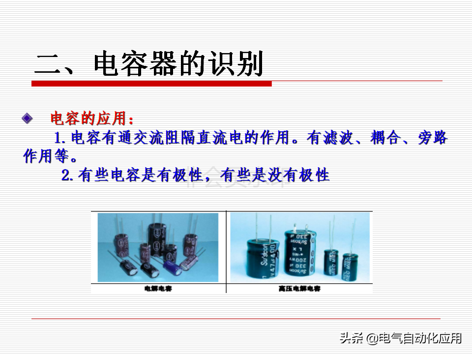 2、识别方法:电容的识别方法与电阻的识别方法基本相同,分直标法、色标法和数标法3种。电容的基本单位用法拉(F)表示,其它单位还有:毫法(mF)、微法(uF)、纳法(nF)、皮法(pF)。