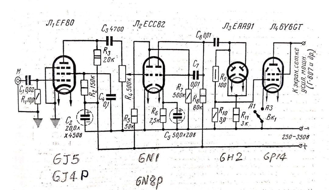 该调制器的调试非常简单。 将它的输出(电子管Л4的屏极)连接到发射机输出管的帘栅极。电位器R4旋转至左边位置。使用开关BK1断开Л4的阴极。然后,选择发射机输出管的帘栅极电阻的阻值,从而改变帘栅极电压,使发射机输出功率达到最大。接通开关BK1,使Л4阴极接地,此时发射机的输出功率应该急剧下降。对着话筒讲话,输出功率应该增加,并且应能注意到功率大小随着话音摆动。调整电位器R4,以达到合适的调制深度。即,在话音达到峰值时,没有明显的失真。