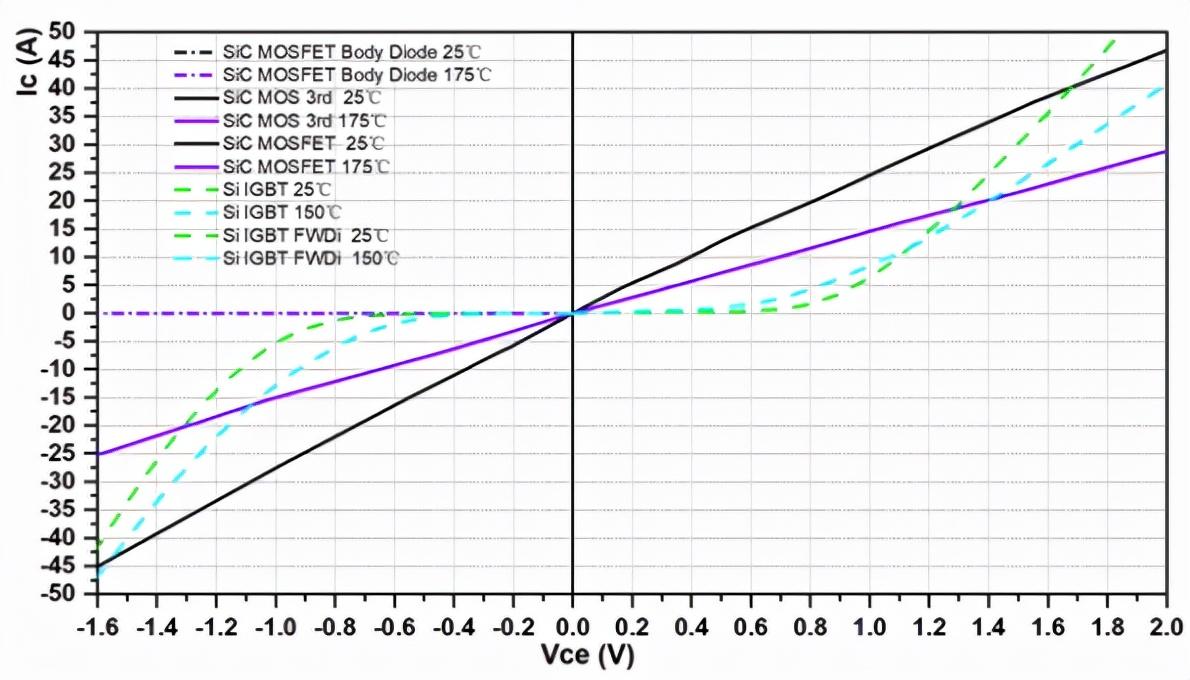 图 2 SiC MOSFET 与传统硅 IGBT 的导通特性比较