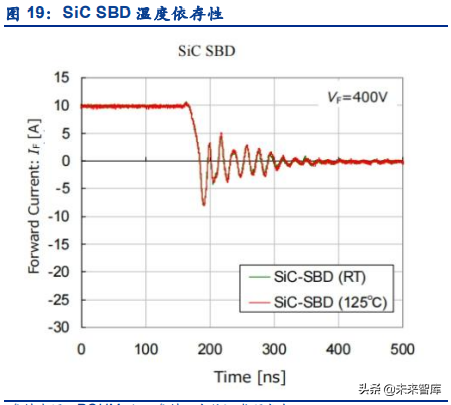 由于碳化硅肖特基二极管的恢复特性,SiC SBD 可大幅减少损耗,稳定实现器件的正反切换。 硅快速恢复二极管在从正向导通状态切换到反向截止状态的瞬间,会产生极大的反向瞬态冲 击电流,器件从正压导通转向反压截止偏压状态。此过程时间长,电流大,会产生较大的损 耗,当器件正向电流越大及温度越高时,恢复时间和恢复电流就越大,损耗也就越大。而碳 化硅肖特基二极管是一种多数载流子导电器件(单极性器件),在工作过程中不会发生少数 载流子存储的现象,也不会产生过大的正反向切换瞬态冲击电流,只有结电容放电的小电流, 因此碳化硅肖特基二极管的开关损耗比硅快速恢复二极管更低。根据 ROHM 测试结果,无 论使用温度和正向电流如何改变,SiC 的反向恢复电流都得到了大幅减小。