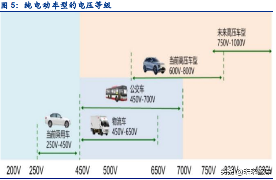 目前,电动车根据带电量不同选择不同的电压等级。一般小型代步车的电压为 48V、60V 和 72V;乘用车的电压范围大约为 250-450V;大巴车、公交车等由于带电量高,其基本电压为 450-700V。在未来,随着对续航里程、充电速度要求的提高,电动车电压有望升至800V-1000V。