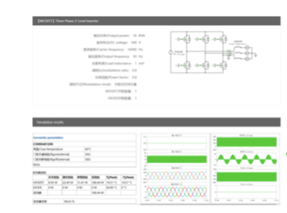 深圳市鹏源电子使用iPowerSiM功耗和效率仿真软件对16kVA压缩机控制器的样机进行仿真,该样机采用Wolfspeed公司的40mΩ、1200V SiC MOSFET。仿真结果表明,在 16kHz 的高开关频率下,效率也可能高达 98.6%。