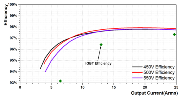 对于方案中的样机,提高了开关频率,同时适当降低了电压变化率,避免了电机轴承、绕组等绝缘层上SiC的高dv/dt造成的共模电流损坏。但控制器仍能实现高达98%的峰值效率,比传统硅IGBT满载高0.5%,轻载和超轻载效率则高1%-5%(如图所示))。