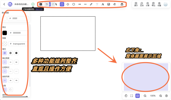 步骤二:对新建的白板进行命名之后,会出现白色界面,上侧和左侧都是制作白板的一些功能,绘出想要的即可,整体效果布局会在右下角呈现。