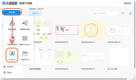 步骤一:进入网页后,画面左侧功能丰富,在左侧新建处点击【新建白板】。