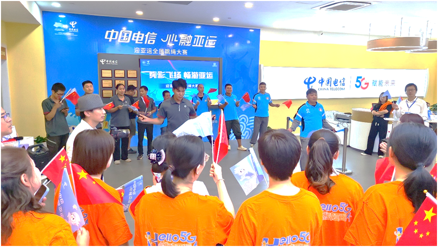 亚运会期间,为体现国企担当,中国电信舟山分公司结合主题党日活动引导党团员积极加入志愿服务队,邀请户外工作者到定海人民北路营业厅“爱心翼站”,参加“绳彩飞扬迎亚运”跳绳大赛。“饿了么”的外卖骑手、“顺丰快递”的快递小哥和电信公司员工一起科普亚运知识、参与跳绳打卡、解密5G智家应用和防范信息诈骗,共同助力亚运会,推广全民健身。
