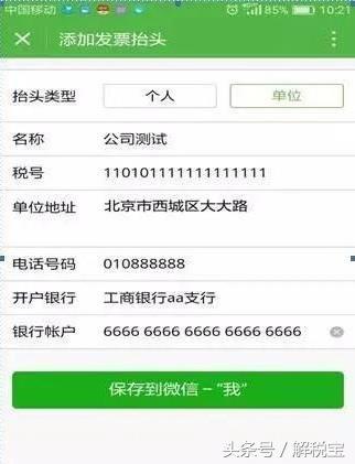4、点击“保存到微信-我”后,点击在我的“个人信息”的“我的发票抬头”可查看公司开票信息。