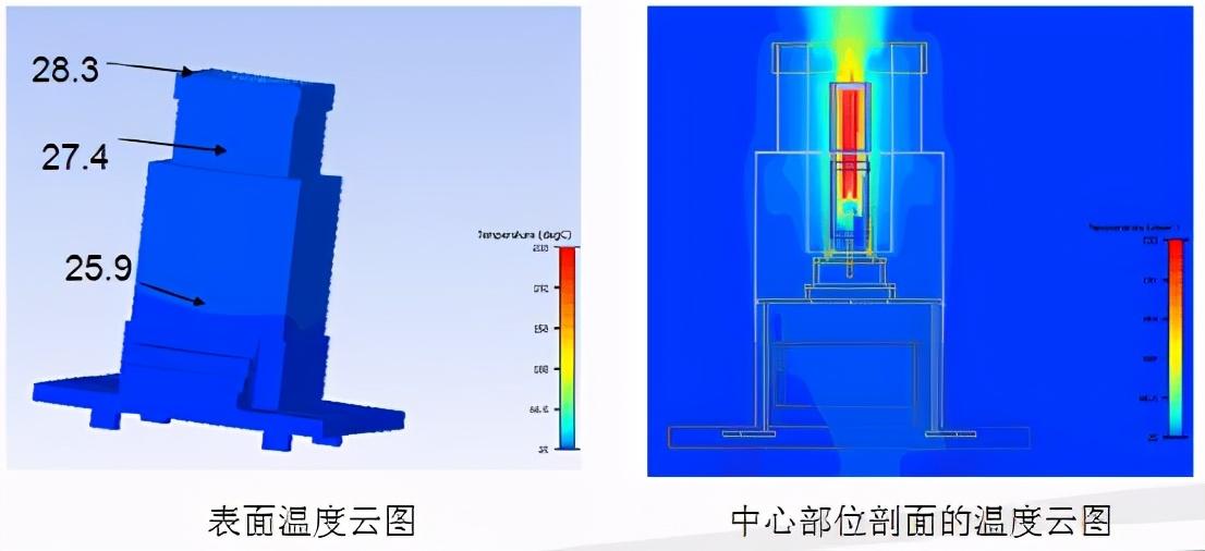 设置T=260C,且在F1下。通过仿真得知,表面最高温度为28.3C, 此时金属网的温度为194.5C。如果在F2,F3状态下表面和金属网温度会更低。