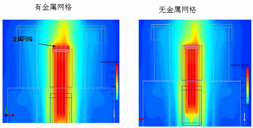 从温度云图对比来看,加金属网格的热均匀性比无金属网格的好。