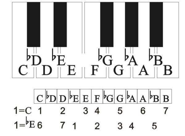 我们知道每一首简谱上都标有调号,就是我们经常看到的在曲谱的左上方有1=E或1=G这样的标记。比如说1=E(也就是E调)就表示我们要把音名E在键盘上对应的音符“3”在简谱中唱“duo”,换句话说就是我们在弹E调简谱时,看到谱子中“1”这个音符,我们需要在键盘上弹音符“3”对应的琴键,看到“2”这个音符,我们需要弹键盘上“#4”这个音符对应的黑色琴键,这样对于我们初学电子琴的业余玩家是不是感觉比较复杂,所以我们就需要进行移调处理,把E调移到C调的位置来弹奏,这样我们曲谱上看到的音符就和键盘上标注的音符完全一致了,但我们听到的音高仍然是原来E调的音高。