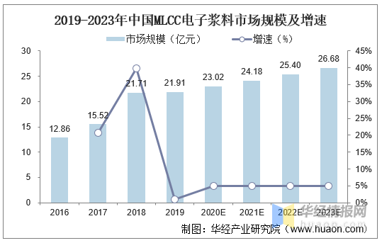 从中国MLCC电子浆料市场规模来看,据统计,2019年中国市场规模为21.91亿元,同比上涨0.92%,年均复合增长速度为19.44%,保持稳定增长态势,预计到2023年,中国MLCC领域电子浆料市场规模将达到26.68亿元。