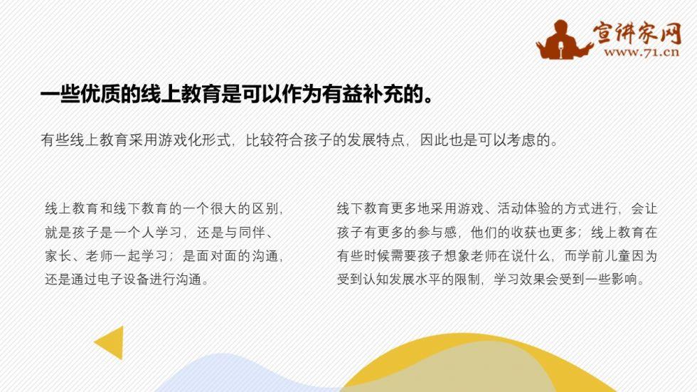 当然,我们也不能将线上教育“一棍子打死”。一些优质的线上教育是可以作为有益补充的。比如,一些幼儿园在疫情期间开展了线上教育活动,这种线上教育活动是需要家长陪同参与的。也就是说,这些线上教育活动是老师指导家长与孩子之间进行的亲子活动。