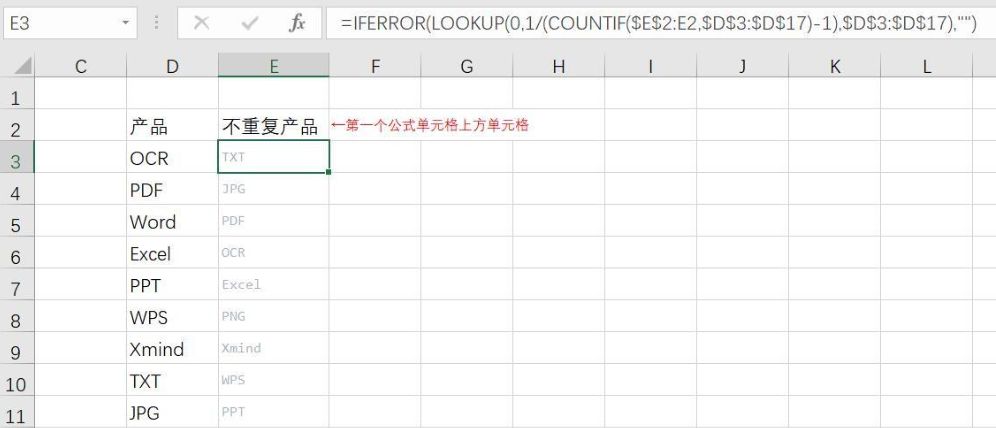 =IFERROR(LOOKUP(0,1/(COUNTIF(对第一个公式单元格上方单元格的绝对引用:对左侧的相对引用,数据范围)-1),数据范围),"")