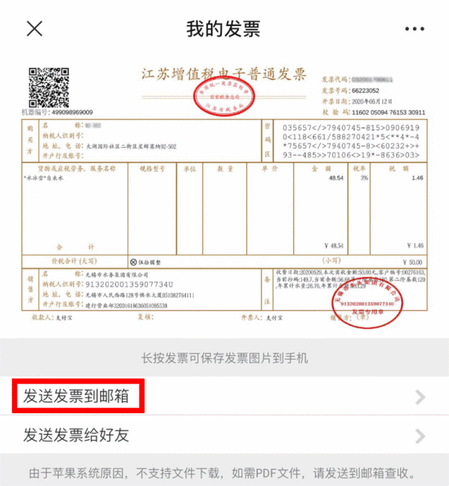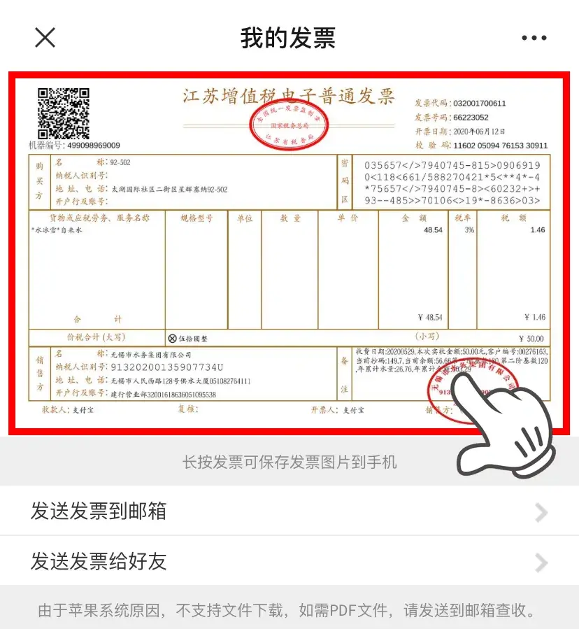 长按发票可保存发票图片到手机,由于苹果系统原因,不支持文件下载,如需PDF文件,请发送到邮箱查收