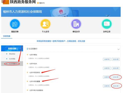 例→方法①:访问榆林市人力资源和社会保障局官网 (http://ylhrss.yl.gov.cn/)点击“榆林人社政府服务大厅”→选择“社会保障卡”→选择”密码修改”(见下图)