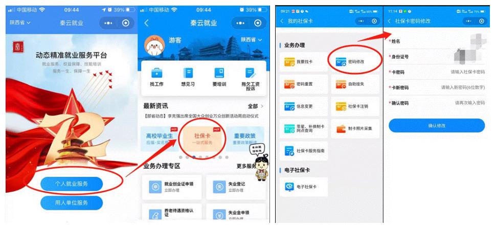 例→方法②:进入“秦云就业”微信小程序→点选“个人就业服务”→点选“社保卡”栏目,点选“密码修改”栏目,按照提示,填写相关信息并提交(见下图)