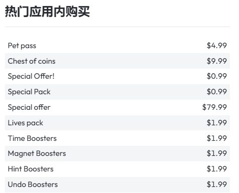 Data.ai数据显示,Pokipet的内购项目均为单项付费 ,包含宠物通行证、金币、游戏助力器等等。类别多元但价格相对便宜,很多项目仅售价1.99美元。