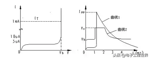 如果用图示仪观察TVS的特性,就可得到图1中左图所示的波形。如果单就这个曲线来看,TVS管和普通稳压管的击穿特性没有什么区别,为典型的PN结雪崩器件。