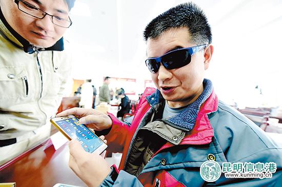 昆明市盲协副主席彭耀宾将安装了读屏软件的手机拿得离脸很近,手指在上面快速滑动、点击,随着他的触摸和滑动,触摸到电话、微信、QQ、淘宝、新闻、高德地图等图标时,就会出现语音朗读。