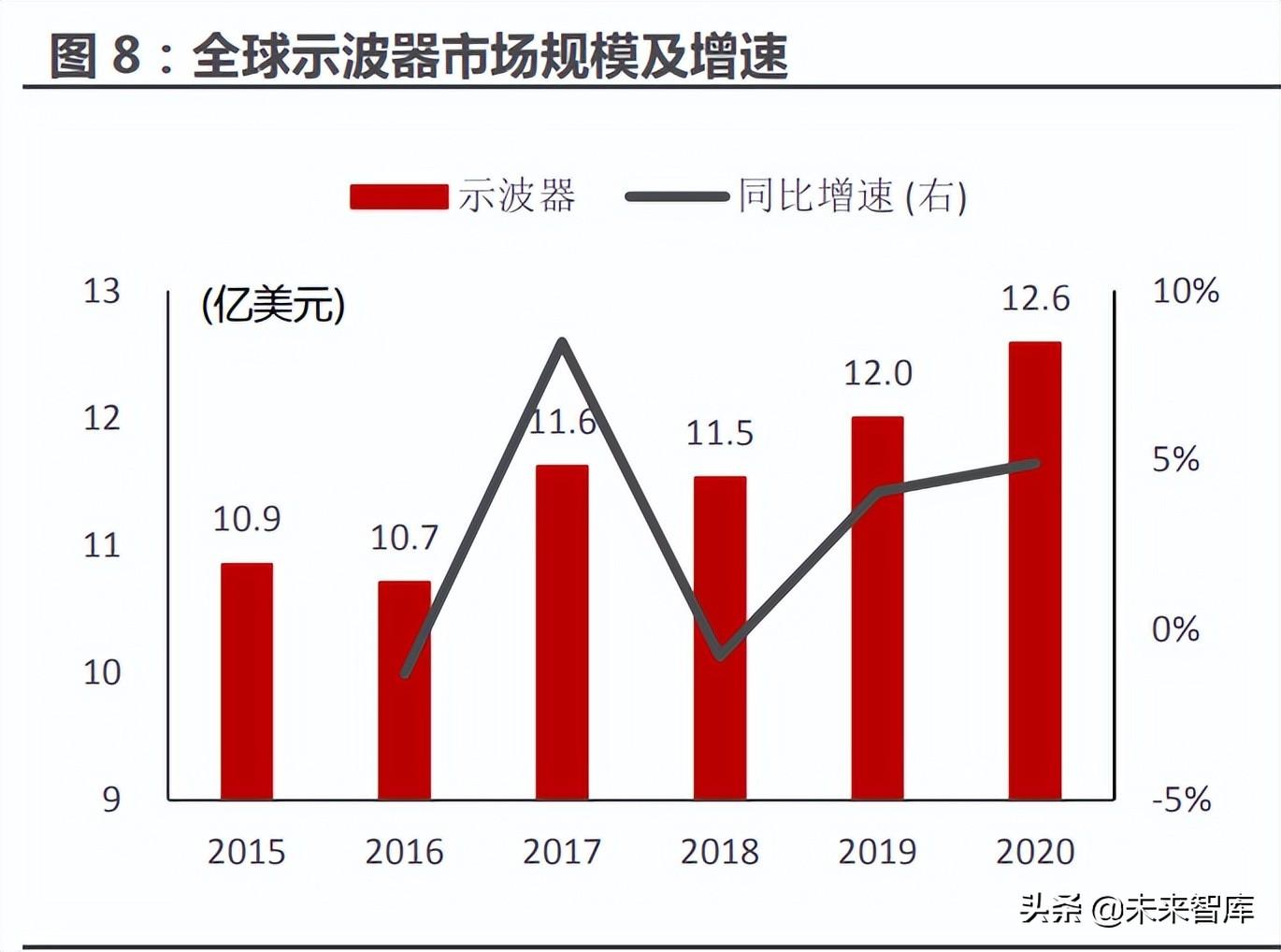 回到电子测量行业,尤其是数字测试领域,“内卷化”也较为明显。比如全球 示波器市场的总收入,根据弗若斯特沙利文统计预测,全球示波器市场 2020 年约 为 13 亿美元,过去 5 年 CAGR 3.0%,低于全球研发支出增速(2015 年-2020年 CAGR 3.5%)。