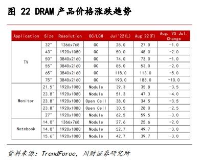 液晶电视/面板 :根据TrendForce,2022年6月,32/43/55/65寸面板分别下跌5/6/8/15美元,为了缓解价格下降和库存带来的压力,面板制造商纷纷计划在2022年第三季度启动更重大的生产控制,第三季度液晶电视面板整体产能将比原计划降低12%。