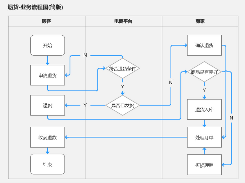 首先按角色划分为顾客、电商平台与商家;其次再画出退货的主干流程,然后判断是否符合退货条件,是否已发货、是否商品完好等分支流程,最后按时间顺序用有向箭头关联,就输出了一份完整的业务流程图。
