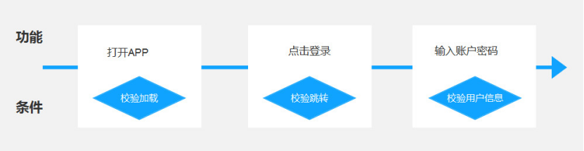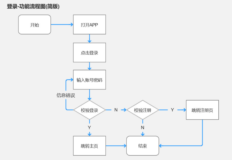 首先列出所有操作功能:打开APP,点击登录,输入账号密码;然后增加判断条件:校验登录信息一致性,校验注册信息一致性;最后按操作次序关联,就得到了功能流程图。