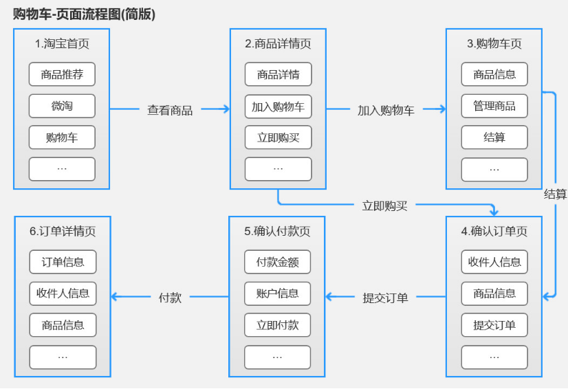 首先列出参与购物车商品结算的相关页面:淘宝首页、商品详情页、购物车页、确认订单页、确认付款页、订单详情页;然后列出主要操作功能,最后按照操作次序用连接线关联相关页面,就得到页面流程图。