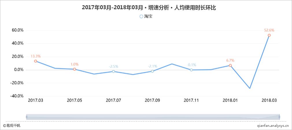2017年3月-2018年3月淘宝APP人均使用时长环比增速分析