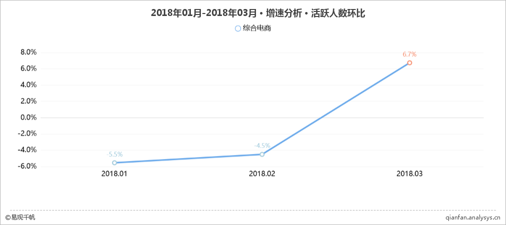 2018年1月-3月综合电商行业活跃人数环比增速分析