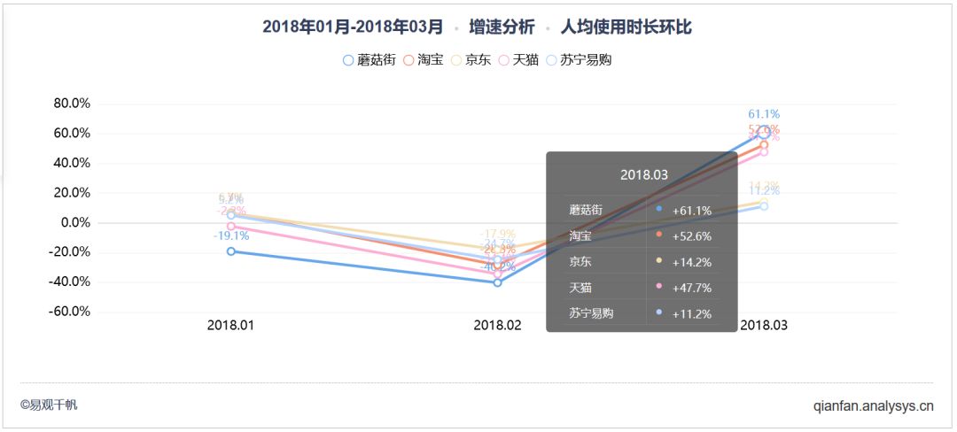 2018年1月-2018年3月蘑菇街、淘宝、京东、天猫、苏宁易购APP人均使用时长环比增速分析